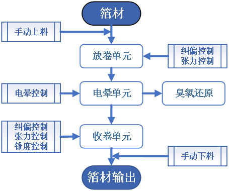 本設(shè)備通過對箔材正反面進(jìn)行連續(xù)電暈,提高箔材表面浸潤性,提高鋁箔達(dá)因值,為下步工序做好準(zhǔn)備